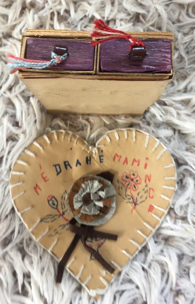 Končím obrázkem, kde se střetávají dva zmiňované světy: Dárek mamince ke Dni matek ve formě malé šperkovnice z poválečných let a koženkové přáníčko k MDŽ z počátku let sedmdesátých.