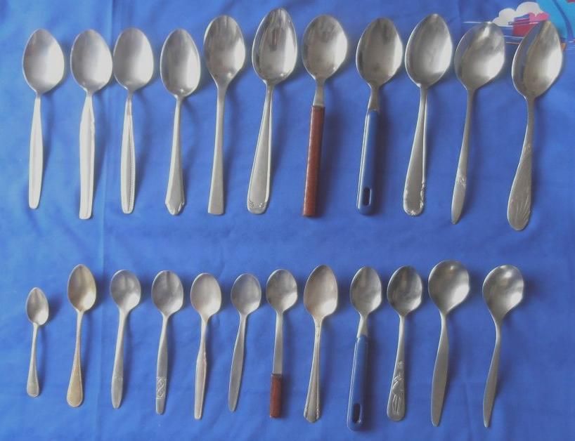 Nejdříve tedy lžíce-vidíte ty rozdíly ve velikosti? dolní řada jsou kávové a dětské, placatou bohužel nemám, ale ta menší, čtvrtá zleva, je pevná, těžší a příjemná. Zcela vpravo je velká ruská. Puberťáci tu gáblovačku milovali.