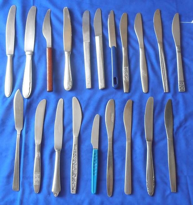 Mezi staršími pány a mezi všemi, kdo něco mažou na chleba, kralují v oblibě nože staré, s dlouhou čepelí. I ten s hliníkem, druhý zleva, je příjemný do ruky jako správně těžký a tvarovaný. Ten divný dole vlevo je z rybího příboru.