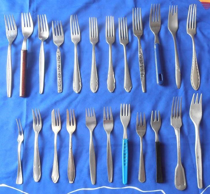Opět můžete popřemýšlet-vidličky s dlouhými hroty jsou většinou 60 a více let staré, čtvrtá zprava je ruská (mají stále v oblibě pořádný kus příboru a zdobení), dole jsou dětské a na zákusky, ale zcela vpravo hliníková a vedle ní skvělá stoletá na mačkání pomazánek.
