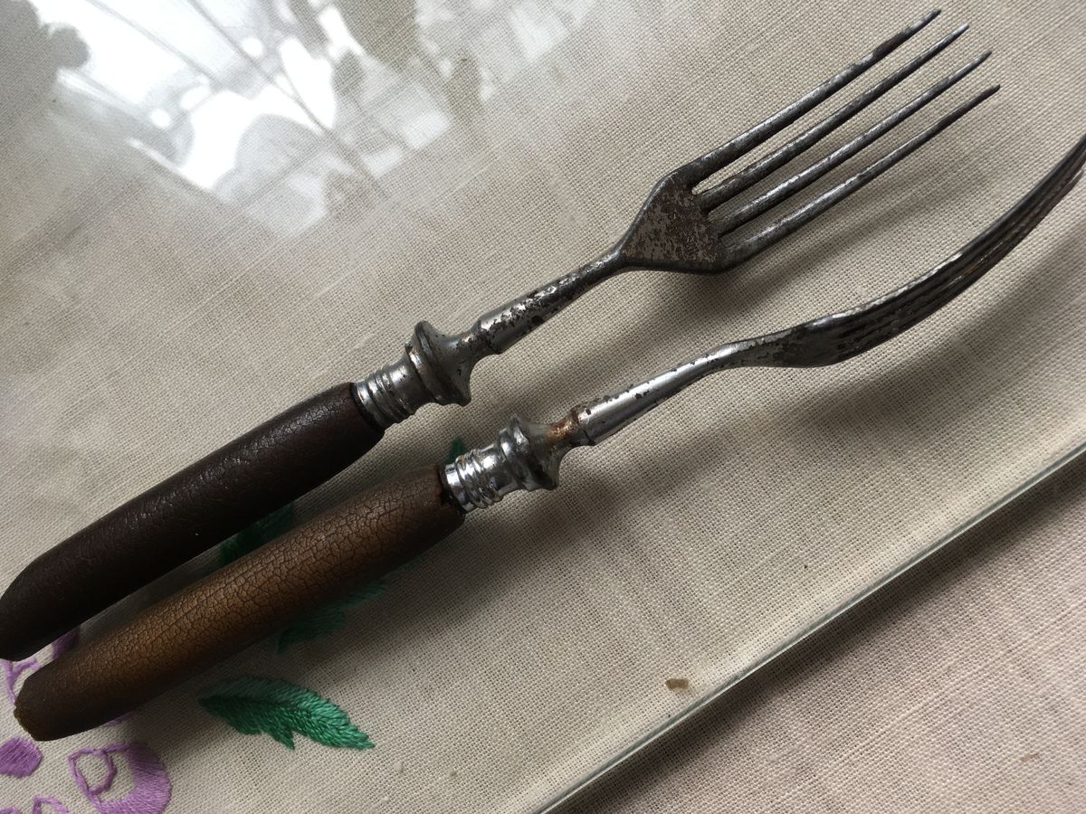 Určitě nedoporučuji brát si příbor s dřevěnou nebo umělohmotnou rukojetí (mimo více, jak stoleté vidličky, jaké ukážu na dalším obrázku). Typ s dřevěnou rukojetí z obrázků nahoře je náročný na údržbu a jakmile se lak zničí, vypadá hnusně. Na užitku se moc nezmění, je to na vás. Typ s umělou rukojetí (modrou hladkou s očkem) je levný, prodával a snad se dosud prodává se stojanem-kolotočem v mnoha barvách, kov se snadno ohýbá a mezi něj a umělou hmotu se dostane špína. Prastaré vidličky dole jsou sice narezlé, zrovna tyhle nebyly dobře uložené, ale jsou tu spíše jako příklad tvaru. Mám i lépe zachovalou, někde v komoře. Jako nějaké nářadí by se i tak uplatnily.