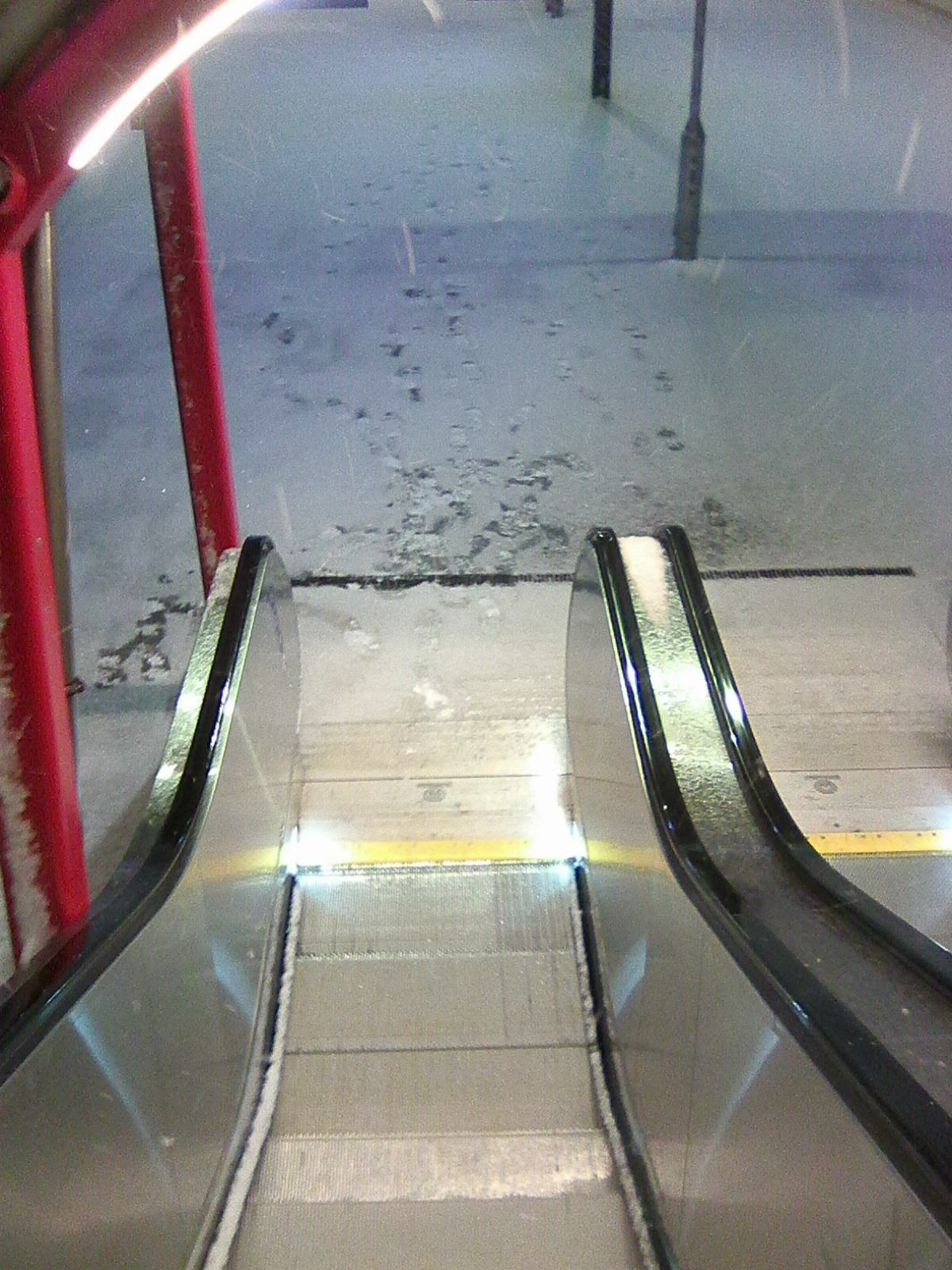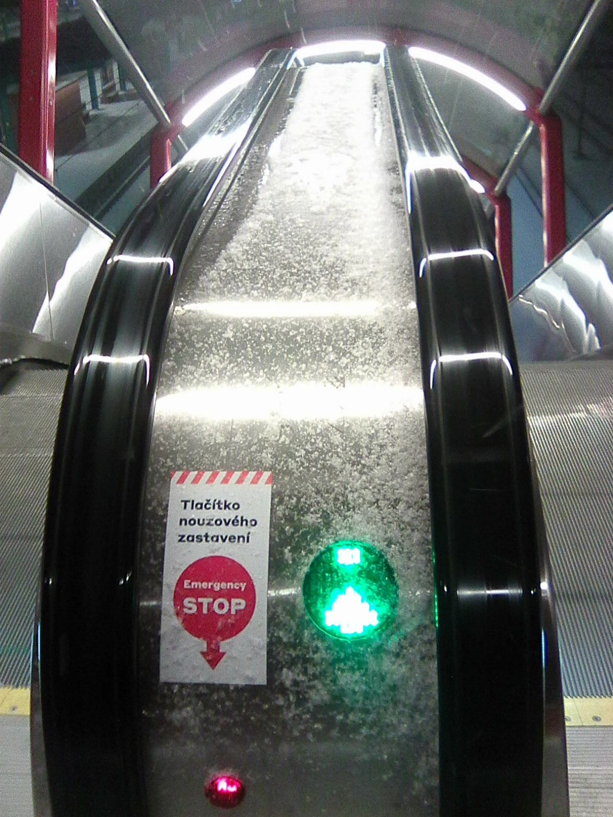 Nejenže se eskalátory vlivem deště a sněhu a související vlhkosti rychleji opotřebovávají a zkracuje se jejich živostnost, ale samotný nástup na ně a výstup z nich po kluzkém sněhu je nebezpečný. Držení se rukama mokrých madel je již jen jakýmsi malým bonusem navíc.