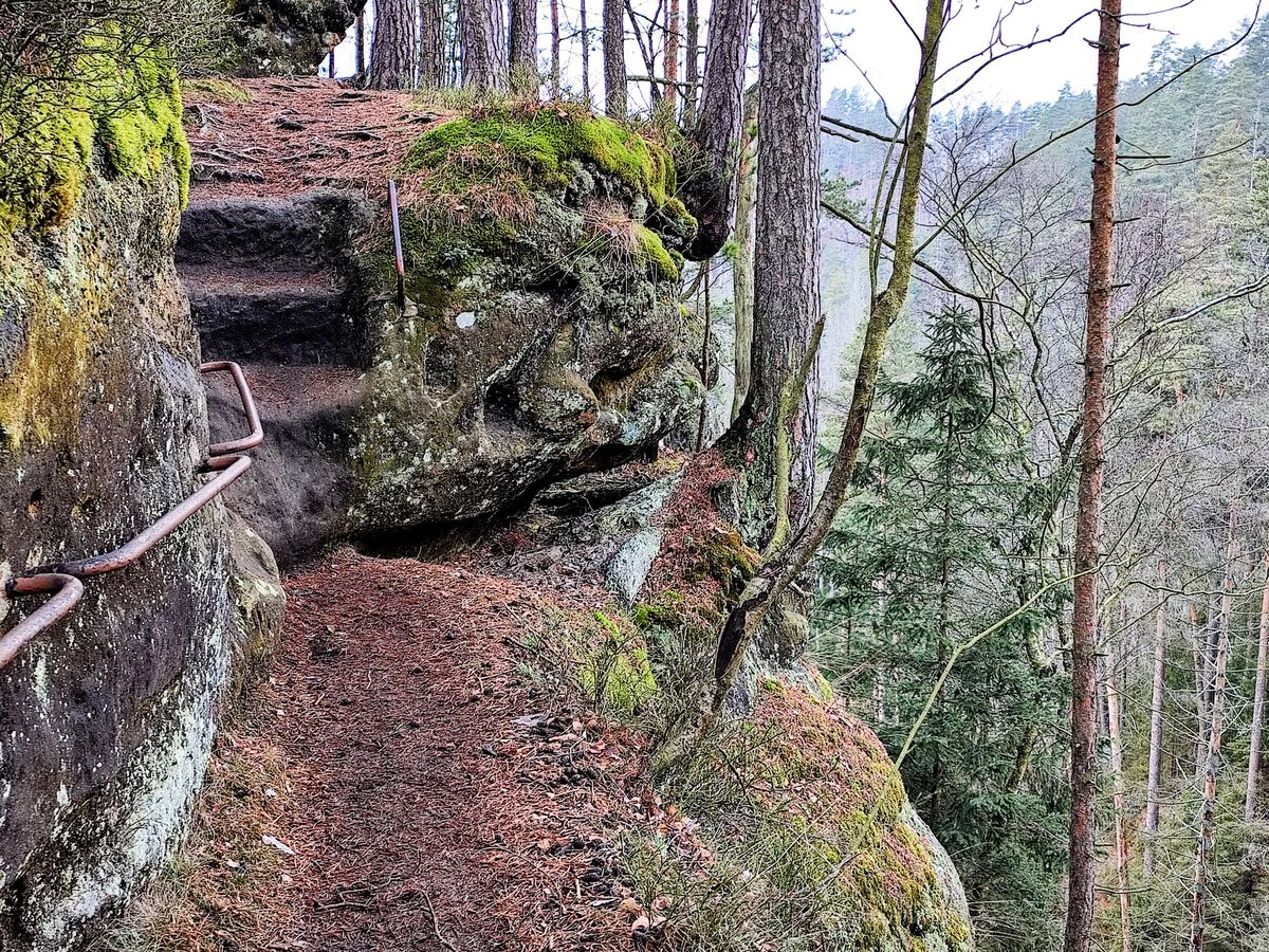 Klikaticí se dostáváme k cíli dnešního výletu. Cestička místy vede snad ani ne po půlmetrové lesní pěšině, napravo se otevírá hluboká strž. Opatrnost je na místě. Bezpečnost nabízí zábradlí, ba i skoby věrně se nabízejíc turistům.