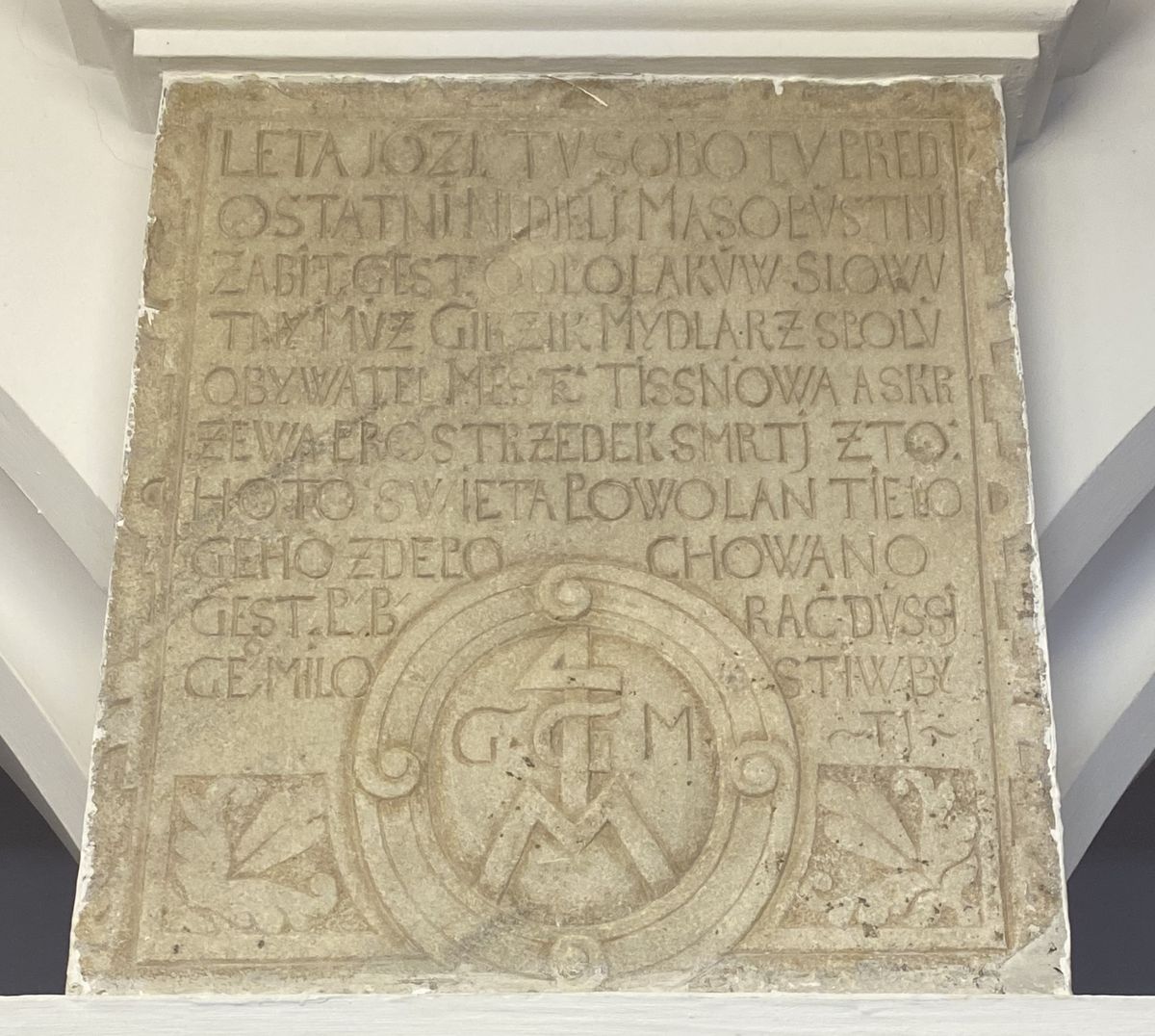 Deska je z leštěného mramoru, ve spodní části je zdobena purkmistrovými iniciálami a ratolestmi a nese text: „Léta 1621 tu sobotu, tu před ostatkovou nedělí masopustní zabit jest od Poláků slovutný muž Jiřík Mydlář z spoluobyvatel města Tišnova a skrzeva prostředek smrti z tohoto světa povolán, tělo jeho zde pochováno jest. P.B. (Pán Bůh) rač duši jeho milostiv býti“.