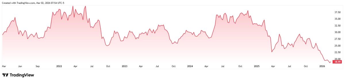 Výkonnost ceny akcií společnosti HP za posledních pět let