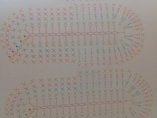 1. řada:15/17/18 řetízkových ok, 1 pevné oko do 16/18/19 řetízkového oka - levá bota respektive do 21/23/24 oka - pravá bota 3. kruhová řada žluté barvy podrážky, 15/17/18ŘO. 1 pevné oko do 42/46/48 oka poslední kruhové řady, 12 řetízkových ok, 1 pevné oko do stejného oka, do kterého jsme na začátku navlékali přízi, 1 řetízkové oko a obraťte.