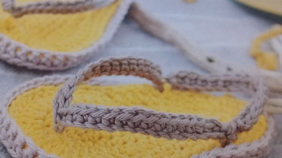 Uháčkujeme 1 podrážku přízí přírodní barvy a jednu podrážku žlutou přízí. Oba díly na sebe položíme, aby žlutá podrážka byla nahoře a oba díly k sobě přiháčkujeme přírodní přízí k sobě jednou řadou krátkých sloupků 51/55/57 ok. U žluté podrážky háčkujeme pouze za zadní niť ok, u podrážky přírodní barvy pouze za zadní niť ok. Kruhovou řadu ukončete pevným okem k prvnímu krátkému sloupku.