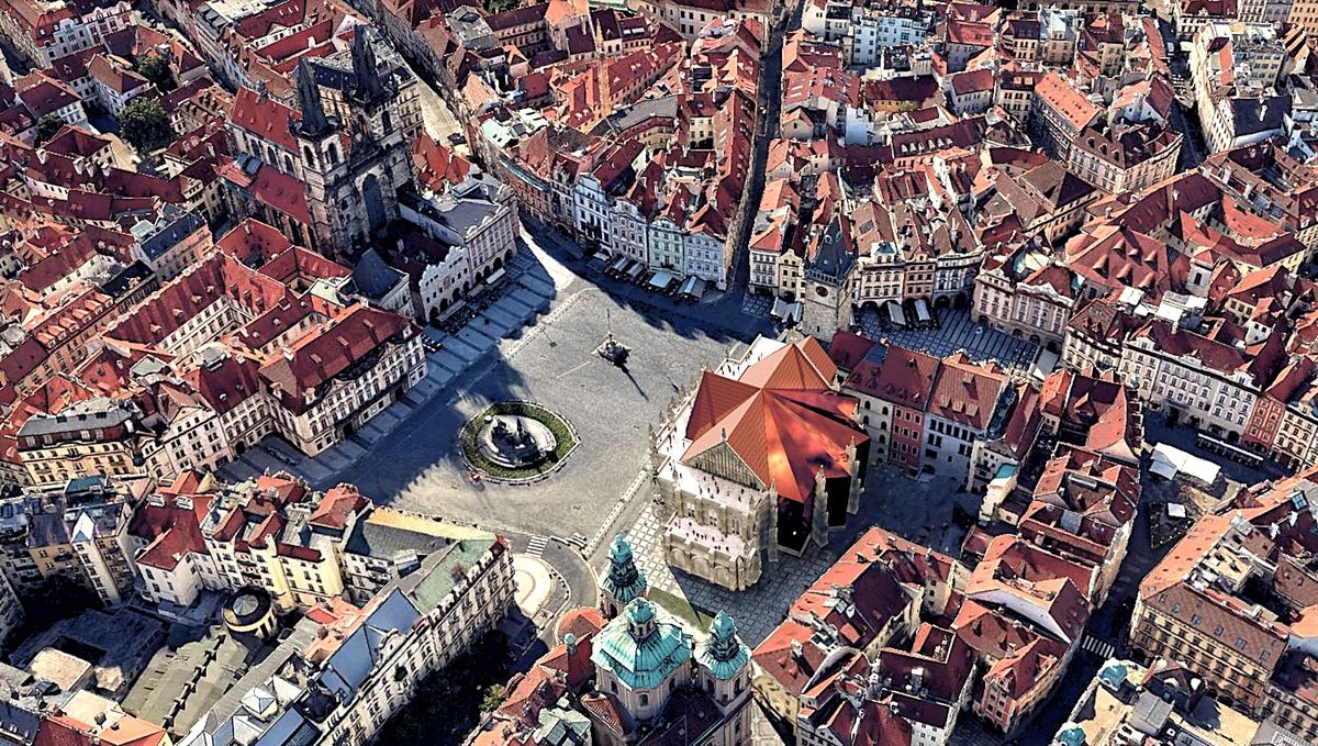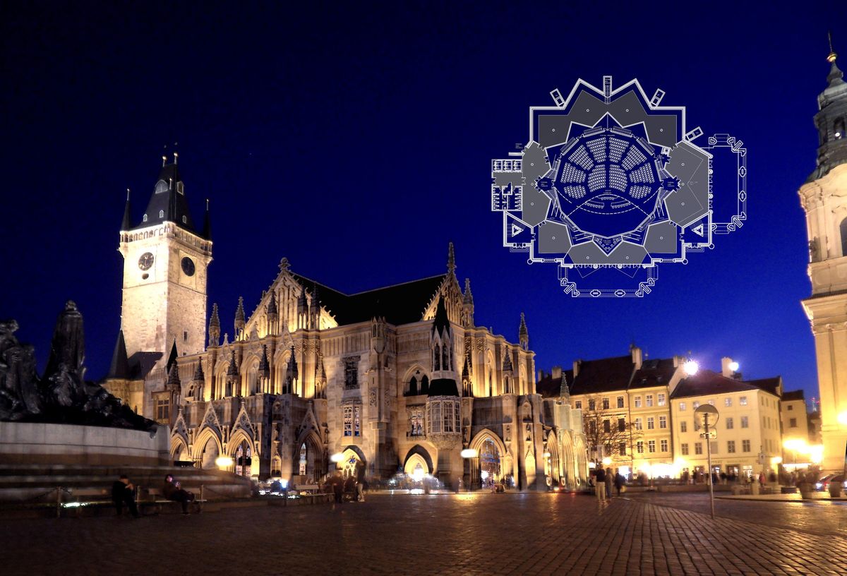 2. Urbanismus: Půdorys má potenciál přirozeně uzavírat prostor náměstí a zároveň vytvořit nový dominantní bod – soustředný, pozorovatelný ze všech stran. V kombinaci s věží Staroměstské radnice vznikne kontrast mezi vertikálním a centrálním akcentem. Věž a kruh – dva archetypální tvary, které v sobě nesou hlubokou symboliku, jež sahá od mytologie přes náboženství až po psychologii nevědomí.