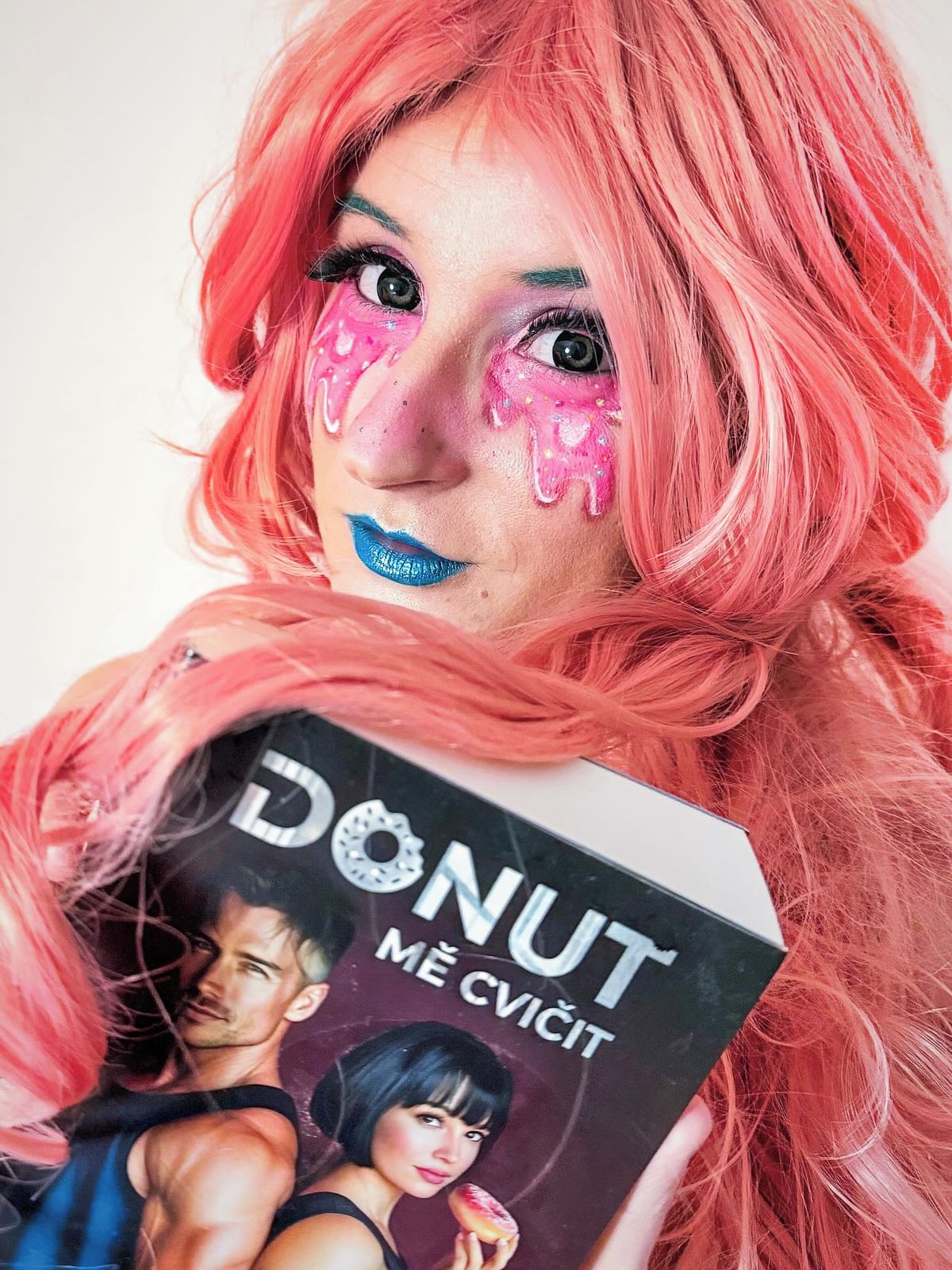 Vizuálně lákavá obálka nám rovnou představuje podobu hlavních protagonistů Radky a Romana. A jak název napovídá, Roman se bude snažit Radku donutit cvičit, i když Radka miluje donuty. No a u toho se zamilují.