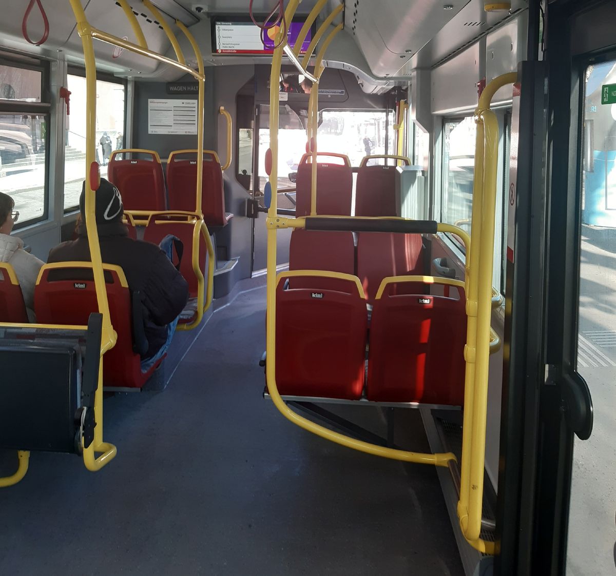 Interiér autobusu je v mezích možností prostorný a posezení pohodlné. Prostor kolem dveří je zjevně řešený tak, aby umožnil rychlý nástup a výstup cestujícím s omezenou možností pohybu – ať už kvůli stáří, handicapu nebo korpulentní postavě.