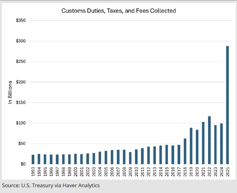 Podle údajů amerického ministerstva financí se za rok 2025 vybralo z cel, daní a poplatků 287 miliard dolarů. Jedná se o 192procentní nárůst oproti minulému roku. Bohužel z pohledu USA se nejedná jen o pozitivní věc.