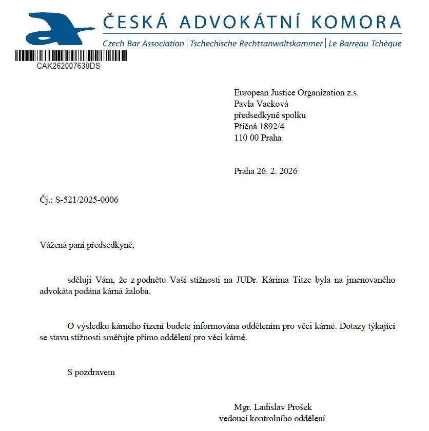 Kárim Titz se dostal do kárného řízení poté, co Česká advokátní komora (ČAK) potvrdila, že na něj byla podána kárná žaloba, a to výslovně „z podnětu“ stížnosti organizace European Justice Organization (EJO).