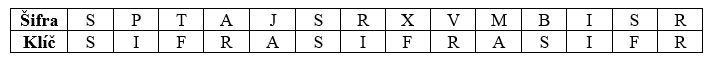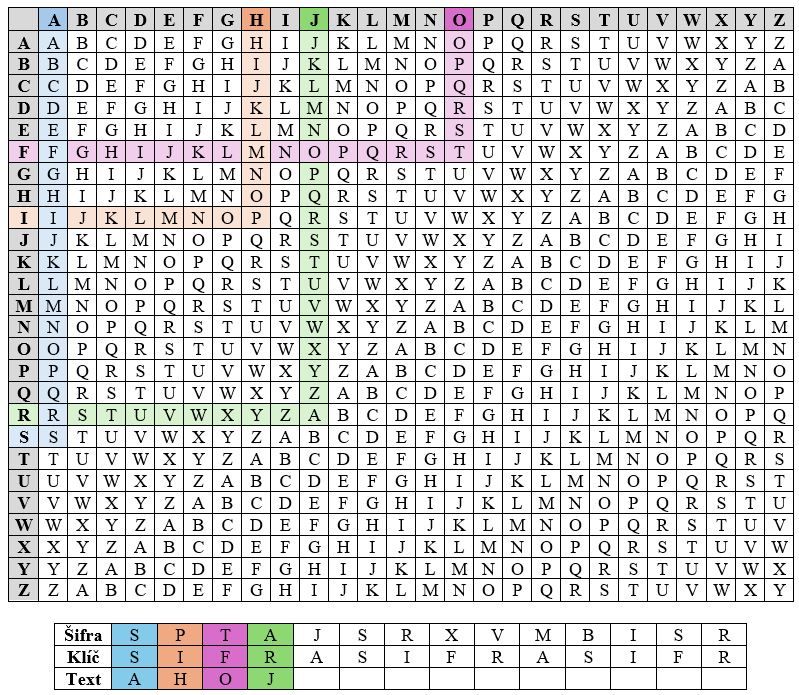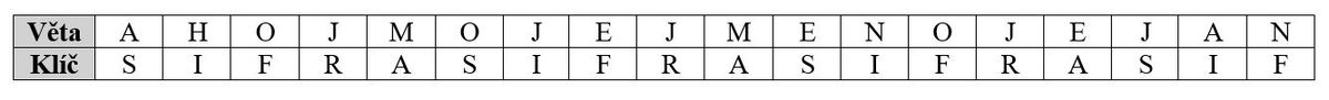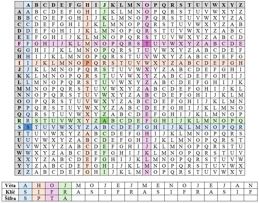 Vigenèrova šifra pracuje s páry písmen, která udávají souřadnice řádku a sloupce podobně jako při hře lodě. V průsečíku vybraného řádku a sloupce se následně objeví zašifrované písmeno. Abychom měli pro každé písmeno věty i druhé písmeno z klíče, budeme klíč opakovat tak dlouho, až bude mít stejný počet písmen jako věta. Příklad je níže.