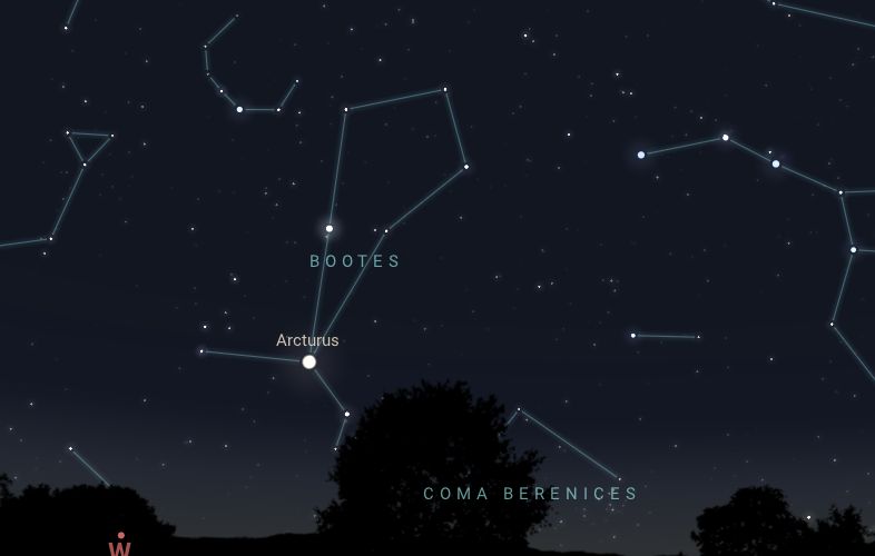Hvězda Arcturus v souhvězdí Pastýře. Pokuste se třeba za 50 let identifikovat změnu jeho polohy vzhledem ke zbytku souhvězdí.