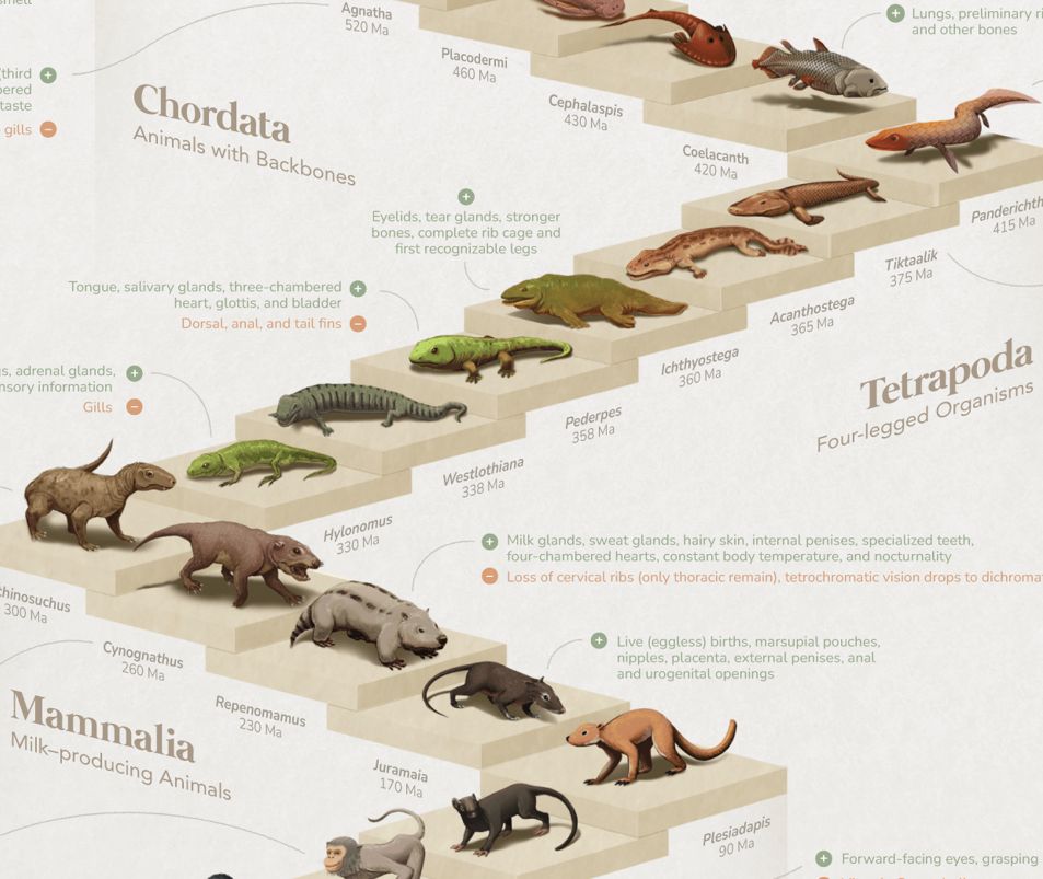 - Důkazy z fosilního záznamu – fosilie ukazují postupné změny druhů v čase, včetně přechodových forem mezi velkými skupinami organismů (např. archeopteryx jako přechod mezi dinosaury a ptáky).
