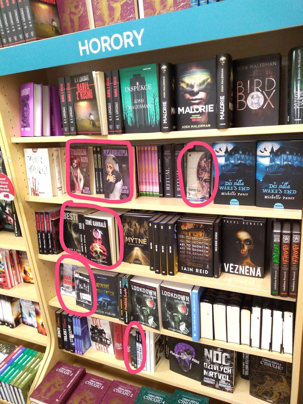 Fotka z knihkupectví, kterou jsem před pěti lety Danu Simmonsovi posílal, aby viděl, jak nás všechny tady v Česku knihkupci zařadili do stejného regálu.