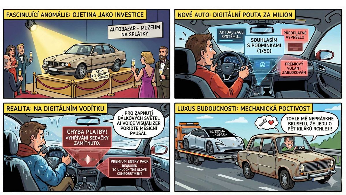 Pohled do bazarů odhaluje čisté zoufalství. Lidé se drží starých atmosférických motorů jako klíště. Vědí totiž, že tyhle stroje mají v sobě ještě zbytek mechanické cti. Tyto vozy se nerozsypou ve chvíli, kdy vypadne signál 5G, a jejich opravu zvládne průměrně zručný mechanik s klíčem v ruce, nikoliv programátor vyslaný přímo ze Silicon Valley. Stali jsme se vězni halucinace, podle které nás větší počet asistentů dělá lepšími řidiči. Skutečnost je taková, že zatímco nám auta neustále „napovídají“ a sahají do řízení, naše pozornost tupne a peněženky krvácejí. Platíme nepředstavitelné sumy za věci, které vteřinu po vypršení záruky znehybní celé vozidlo kvůli jedné vadné diodě nebo špatnému řádku v kódu.