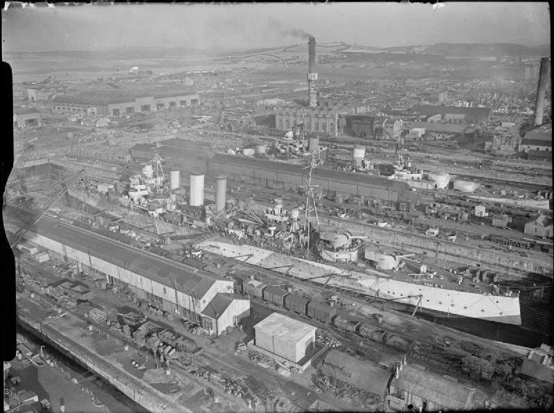 Snímek rosythských loděnic pořízený během 2. sv. války, v popředí těžký křižník HMS Berwick