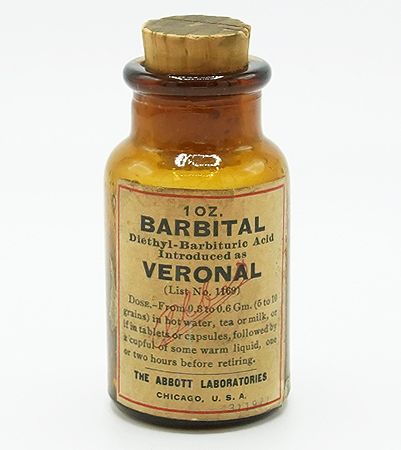 Veronal (obsahující barbital) vystavený v muzeu. Jde patrně o více než sto let staré originální balení i obsah.