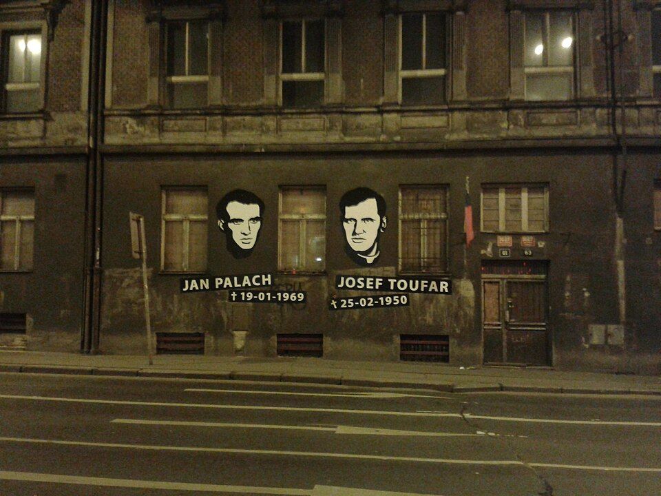 Památník Josefa Toufara a Jana Palacha na budově bývalé nemocnice v Legerově ulici