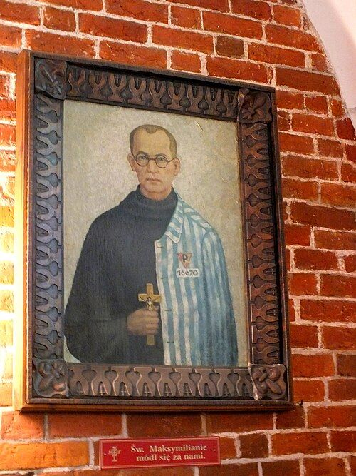 Obraz sv. Maxmiliána Kolbeho v bazilice Nanebevzetí Panny Marie v Kolobrzegu