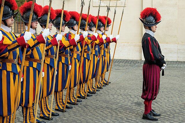Příslušníci Švýcarské gardy během smutečních obřadů ve Vatikánu