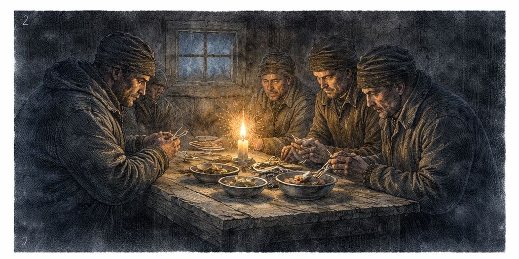 Skromná štědrovečerní večeře v táboře. Kousek chleba, miska jídla a svíčka – drobnosti, které pro vězně znamenaly víc než samotné jídlo.