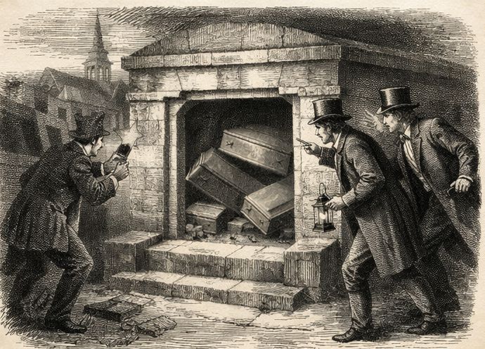 Dobová představa otevření Chase Vault – příběh o záhadně přesunutých rakvích se rychle rozšířil po celém britském impériu a stal se senzací své doby.