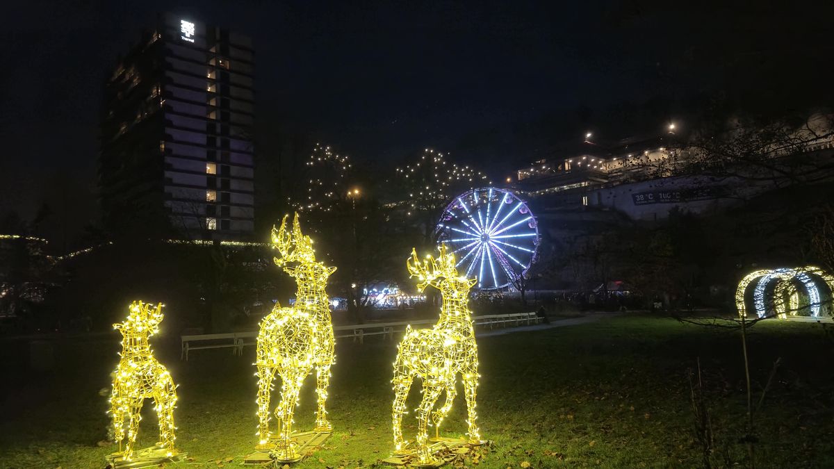 Pokud by vám i tohle bylo málo, Vary mají v rukávu další trumf. Stačí naskočit na lanovku na Dianu a za pár minut se ocitnete vysoko nad městem. Pokud tedy budete mít více štěstí než my (přes hustou mlhu od výstupu z lanovky jsme téměř neviděli ani tu rozhlednu), tak si můžete užít výhledy na všechno to blikající vánoční šílenství dole v údolí.