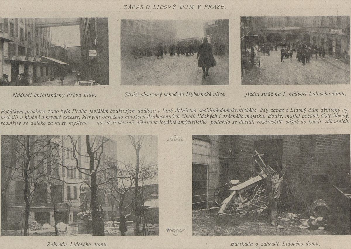 „O 3 hodině odpolední přišli do lidového paláce policejní úředníci, aby tiskárnu zapečetili, a sice proto, že ředitel této tiskárny a faktor byli dopoledne násilím vyhnáni.“ Doprovázel je silný oddíl policie a četnictva. V té době se v Lidovém domě také konala schůze několika set komunistů. Dále opět Národní listy: „Když shromáždění spatřili stráž a četníky, a zvěděli oč jde, podnikli na četníky a strážníky útok holemi a kamením, které házeno bylo také z oken, a sklenicemi, načež se zabarikádovali. Stráž dostala rozkaz vytlačiti je, byla však uvítána deštěm kamení, sklenic a kusy nábytku, přičemž těžce byl zraněn četník K. Pokorný a to sklenici do spánku. Musil být odvezen do posádkové nemocnice. Dále zraněn byl četnický strážmistr F. Pilka sklenicí do hlavy, nadstrážník F. Svoboda do lopatky, nadstrážník Jos. Míšek pod levé oko, policejní inspektor Pacovský, jejž odvezla záchr. stanice a strážník legionář Josef Rada židlí do hlavy. Mimo to bylo 5 četníků pořezáno. Na straně demonstrantů dostalo ovšem mnoho lidí rány obuškem a pažbou, jeden muž, jenž byl bodnut, převezen byl do nemocnice.“