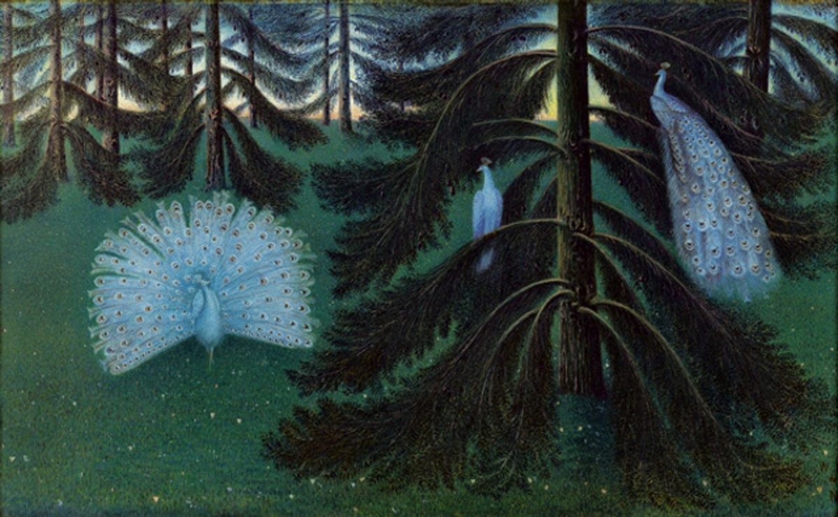 Nejlépe je to vidět na jeho obrazu Pávi (1896), na kterém není nic nadpřirozeného, celá scéna však působí, jako by se odehrávala mimo čas a mimo běžnou realitu, v jakémsi tichém paralelním světě. V lese, mezi jehličím a stíny, je práh jiného světa, který nezná začátek ani konec, jen tichou přítomnost. Pávi ho střeží a my máme na okamžik dovoleno do něj vstoupit.