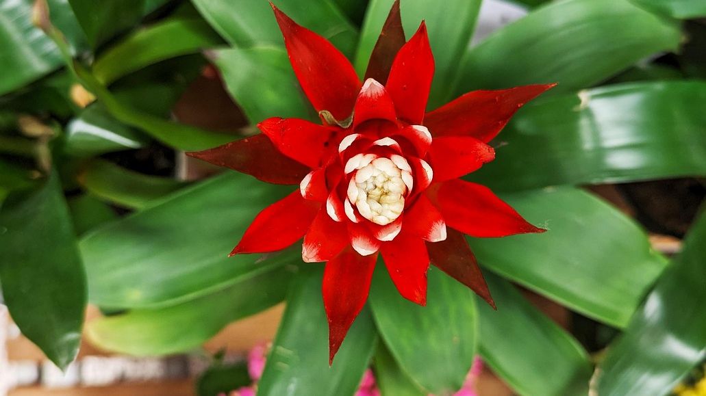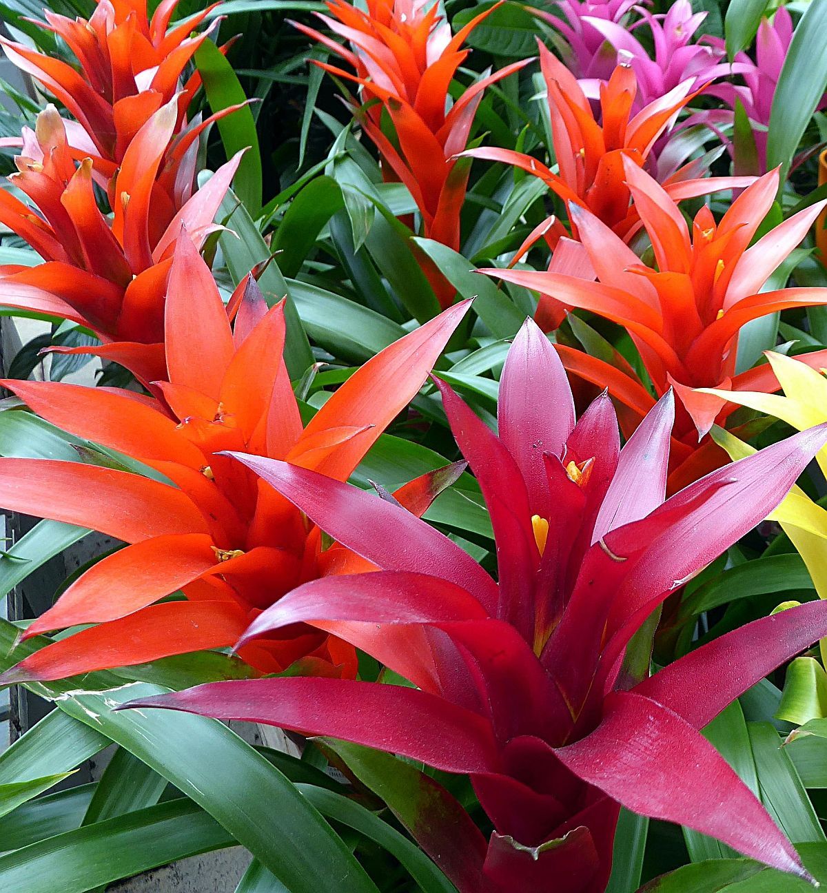 Tahle rostlina z čeledi broméliovitých může být vysazena jako solitér, ale ještě působivěji vypadá výsadba několika rostlin pohromadě – a právě tak bývá v poslední době v květinářstvích k vidění nejčastěji. Umí nalákat na barvy – její „květ“ může být červený, vínový, oranžový, žlutý, fialový, a dokonce i namodralý (i když to jsem zatím viděla jen na internetu, tak nevím, jak moc je to pěstovatelné a jestli to není třeba inkoust). Nicméně slůvko květ bychom si měli dát do pořádných velkých uvozovek. Ty barvy, co na guzmánii obdivujeme, mají totiž na svědomí pestře zbarvené listeny – květy samotné jsou maličké a objevují se na samém vrcholku.
