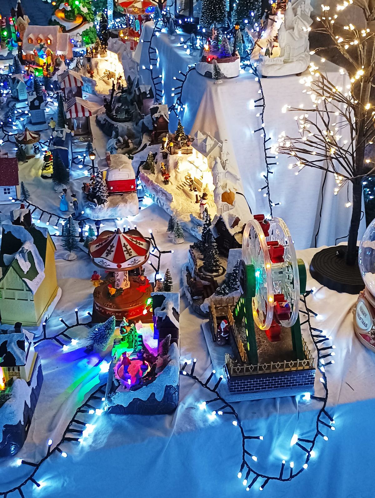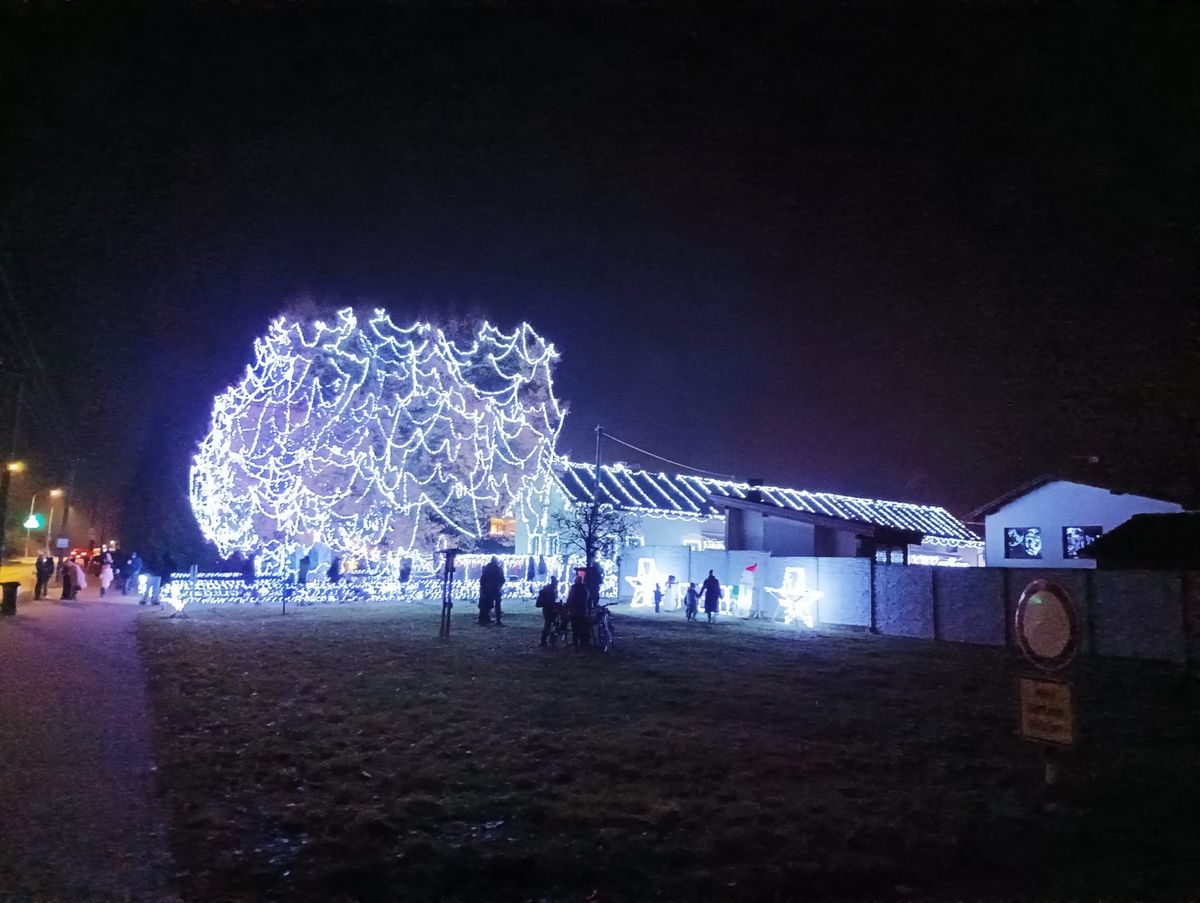 Velký osvětlený strom totiž vidíte už z dálky. Není to žádný vánoční smrček, ale pěkně košatý listnáč na předzahrádce. Světýlka se na něm vinou jako kouzelná pavučinka. S parkováním v okolí je to tedy horší, protože lidí je tu dost, ale nakonec jsme místo v uličce našli. Internetové tipy, co jsem dohledala později, radily parkovat na blízkém fotbalovém hřišti, tak příště.