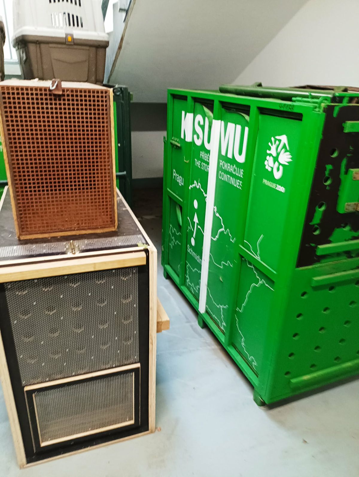 Cestou k onomu tunelu jsme míjeli oba přepravní boxy, v nichž k nám obě nové gorily dorazily. Je tu ale patrný značný nepoměr. Drobná Duni totiž dorazila ve dvakrát větším boxu než Kisumu. Ten se podle slov Martina Vojáčka ve svém boxíku skoro mačkal.