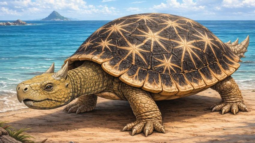 Představte si želvu, která má hlavu jako středověké beranidlo, rohy jako poněkud bizarní nosorožec a ocas obrněný tak, že by s ním mohla klidně vyrazit dveře. Možná si myslíte, že vám právě teď popisuju ankylosaura nebo něco podobného, ale pletete se. A mimochodem, k dinosaurům se vlastně přímo dostaneme.