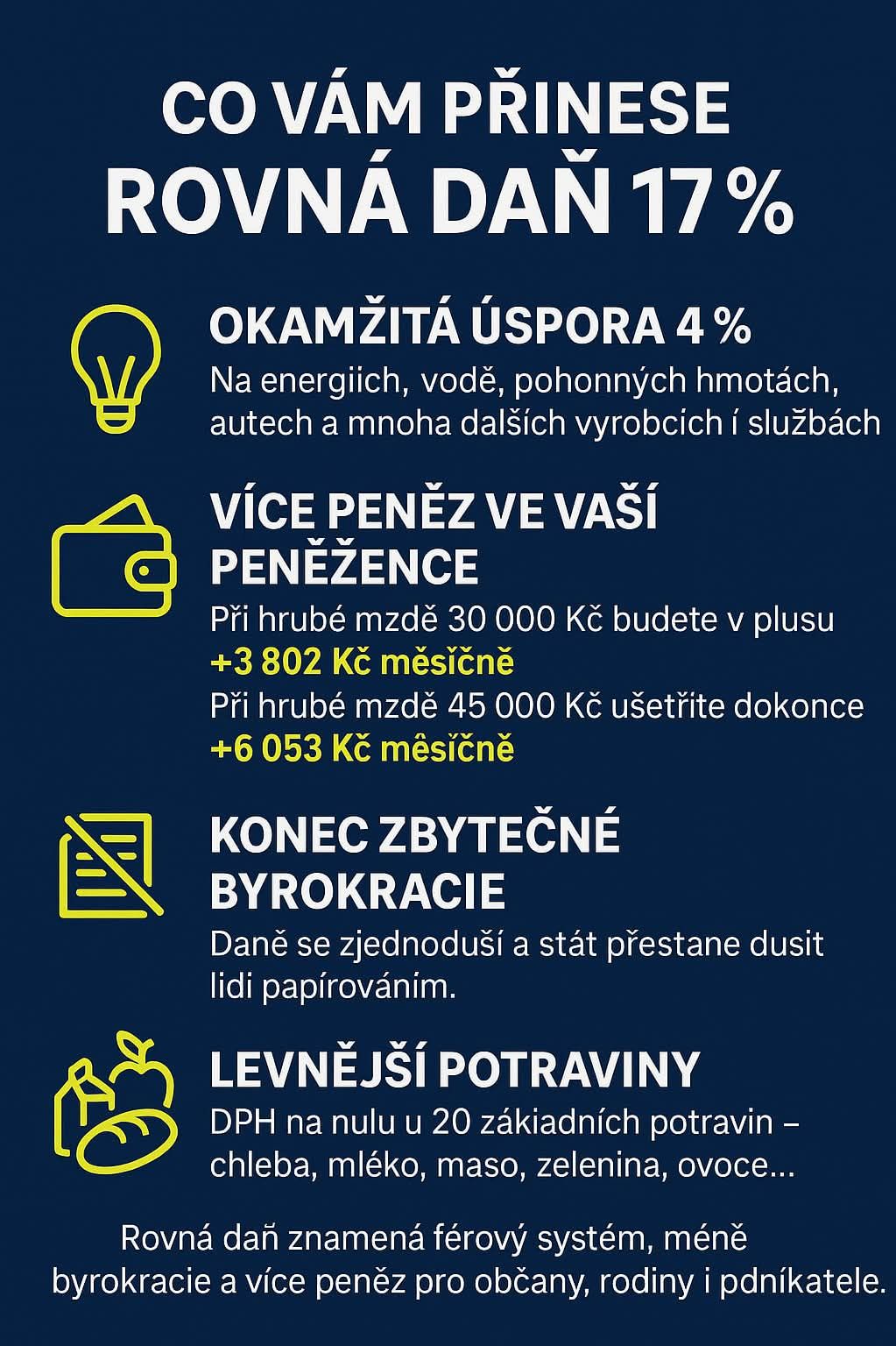 Zavedení rovné daně 17 % s odpočitatelnou položkou 5 000 Kč na každého poplatníka, manželku/manžela a každé dítě.