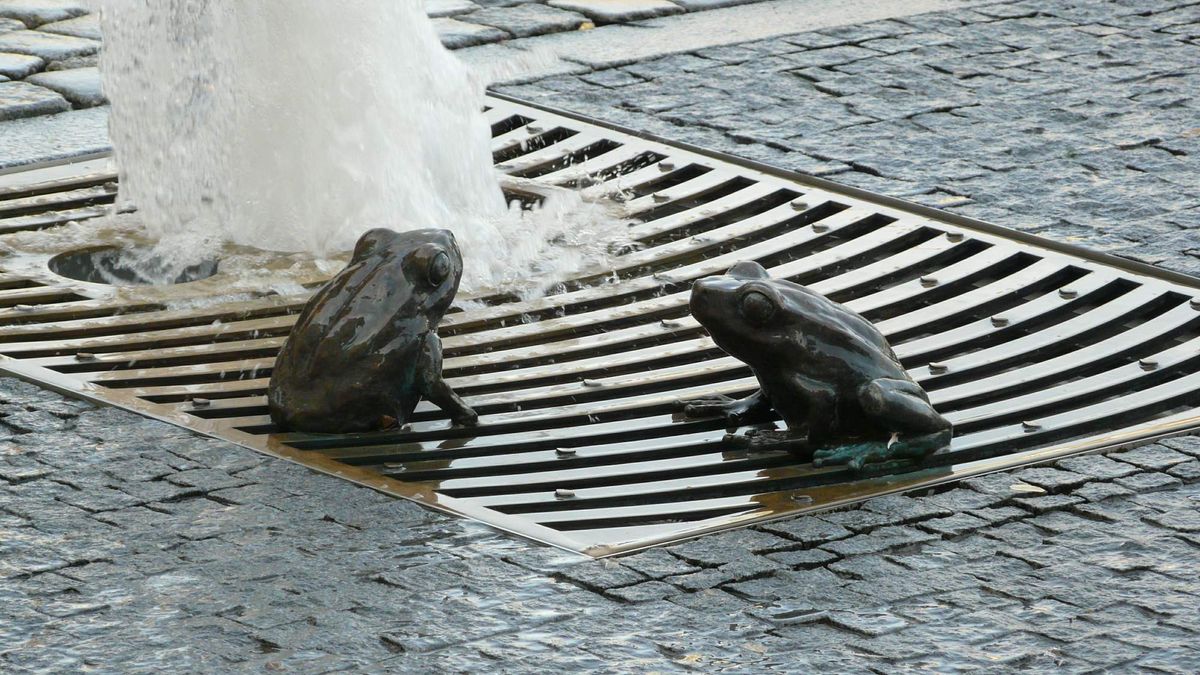 Zelný trh zase oživily pramínky vody, které na železných roštech hlídají žabky a další vodní živočichové. Naštěstí jsou k roštům pevně přichycené, jinak by si už dávno rochnili v kašně Parnas.