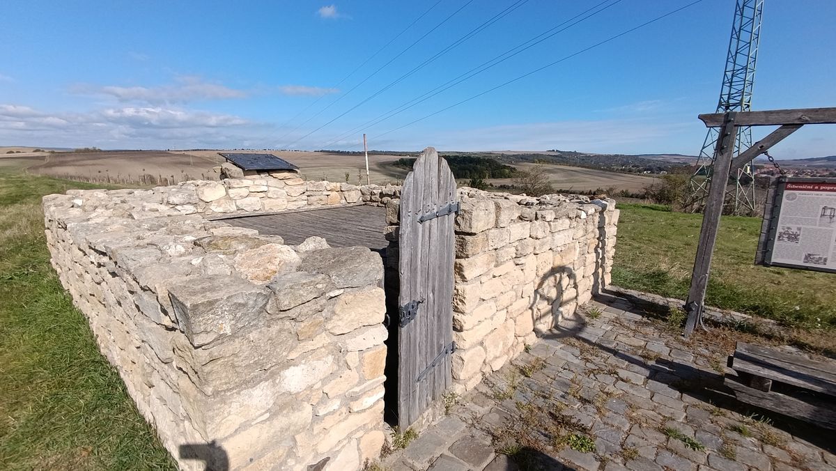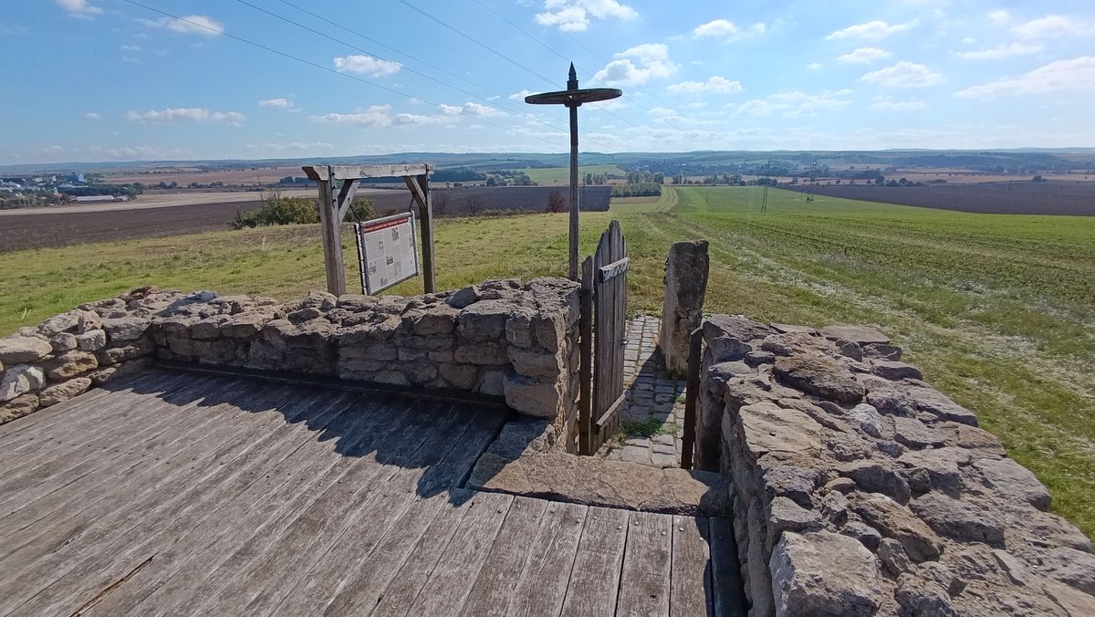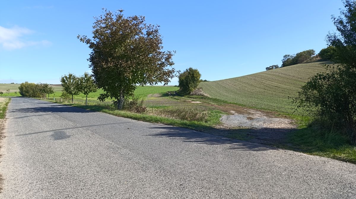 Další část naučné stezky už vede po okresní silnici přes nechráněný železniční přejezd kolem fotovoltaické elektrárny mírně do kopce. Bohužel, naučná stezka není nijak označena turistickými značkami, a dokonce na ní nejsou ani žádné směrové tabulky. A tak jsme víceméně intuitivně došli po zhruba 2 km až k odbočce na polní cestu vedoucí k popravčímu vrchu.