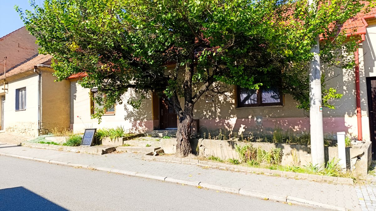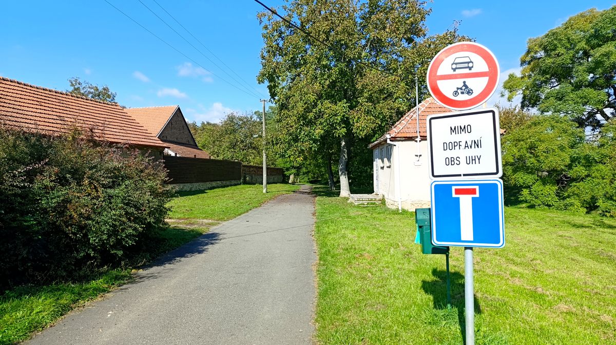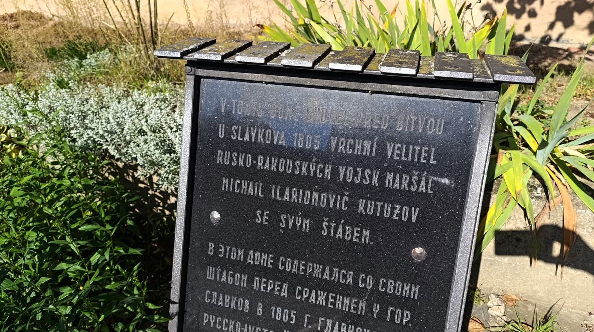 Po zaparkování auta přímo v centru obce mne čekalo jedno velké překvapení: v krátké spojovací uličce mezi parkovištěm a naučnou stezkou jsem náhodně objevil malý domek, ve kterém přebýval maršál Kutuzov a jeho štáb před slavnou bitvou tří císařů u Slavkova v roce 1805. Nafotil jsem domek i pamětní desku před ním, a rychle se vydal s mými dvěma psisky - Barrym a Badym - směrem k naučné stezce (mapa).