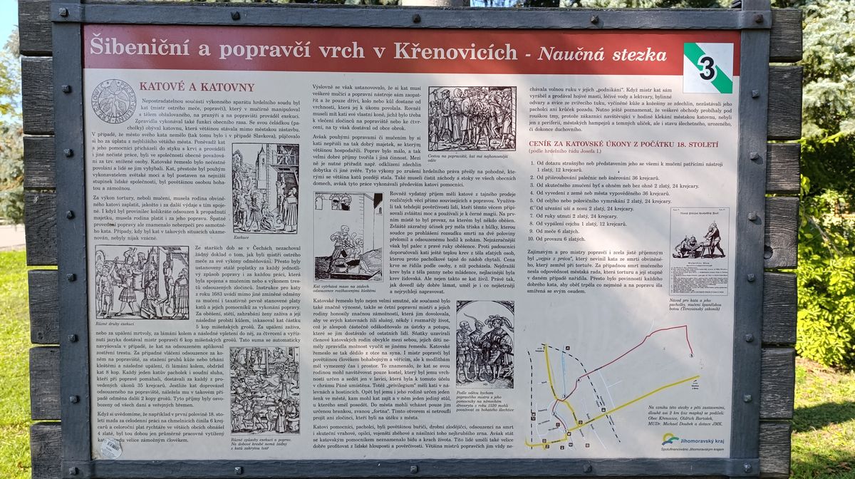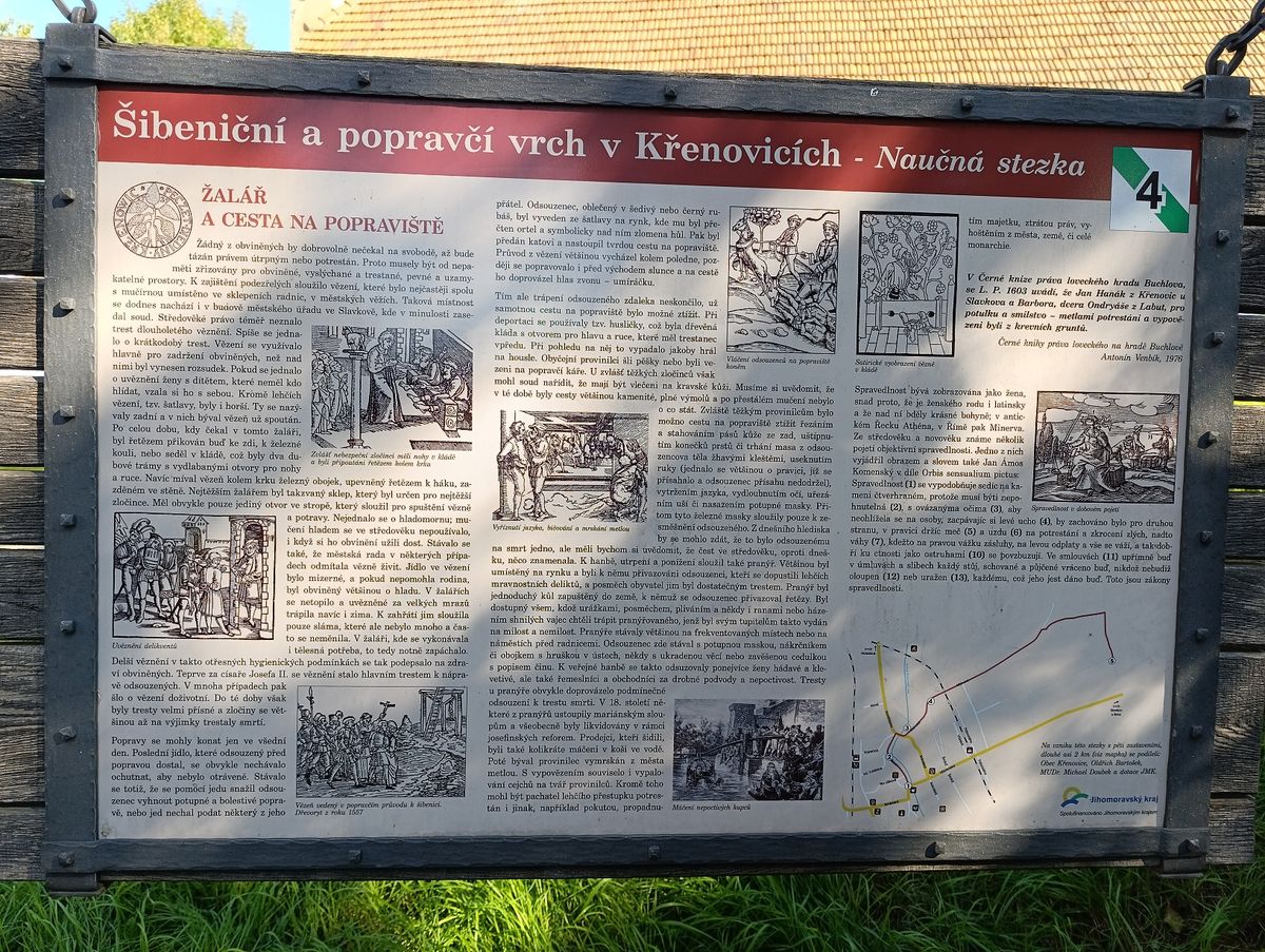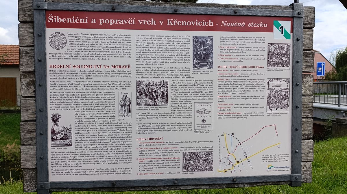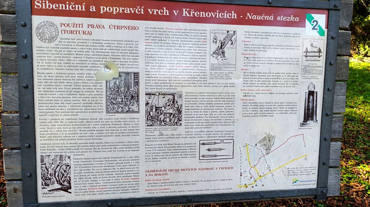První informační tabule je umístěna hned při hlavní silnici z Křenovic do Slavkova, kde se nalézá začátek naučné stezky. Velice poutavý text přibližuje návštěvníkům stezky vývoj hrdelního práva v období středověku. Nad některými obrázky se až tají dech, a nejsem si jistý, zda jsou vhodné pro oči malých dětí. Na druhou stranu, po této stezce asi uvážliví rodiče s malými dětmi nejspíš chodit nebudou…