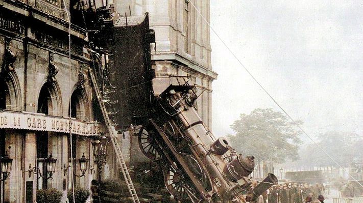 Marie - Augustin náhle uslyšela strašlivou ránu. Otočila se, a nad sebou uviděla výjev jako z nějaké apokalypsy - příď parní lokomotivy se za děsivého syčení páry právě prodírala stěnou nádraží do ulice.
