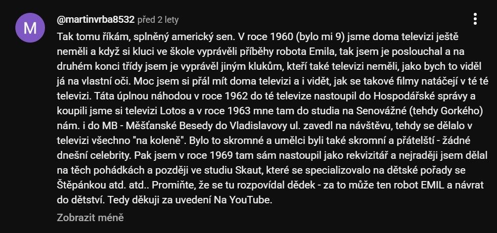 V době uvedení seriálu (vznikl na počátku 60. let 20. století) do televize, jsem byl ještě „předškolák“, a tak si obsah jednotlivých dílů už nepamatuji. Ale dodnes mi utkvělo v paměti, že když se robot Emil pokusil – samozřejmě v dobrém úmyslu - v něčem zalhat, vzápětí se mu rozsvítila žárovka kterou měl místo nosu. Možná, že od té doby začali rodiče říkat dětem „… nelži, nebo ti sáhnu na nos. Jestli mi lžeš, tak ti zčervená.“ A také si vzpomínám, že na Vánoce musela naše maminka poslat robotovi Emilovi balíček s našimi pozdravy, ve kterém byla i malá podkůvka. On totiž robot Emil velice rád louskal šrouby a matičky a všechno co bylo železné, a tak jsme mu chtěli udělat radost malým dárkem pod jeho vánočním stromečkem. Jaké bylo naše překvapení, když nám od něj po 14ti dnech přišla z televize odpověď! Bohužel, dopis se mi nepodařilo zachovat.