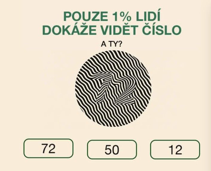 Zadívej se na následující obrázek a zvolna počítej do pěti. Pak už musíš odpovědět. Jaké číslo uvidíš na obrázku? Bude to číslo 72, 50 nebo 12? Pozor, začínáme. (Správnou odpověď najdeš pod článkem ve zdrojích)