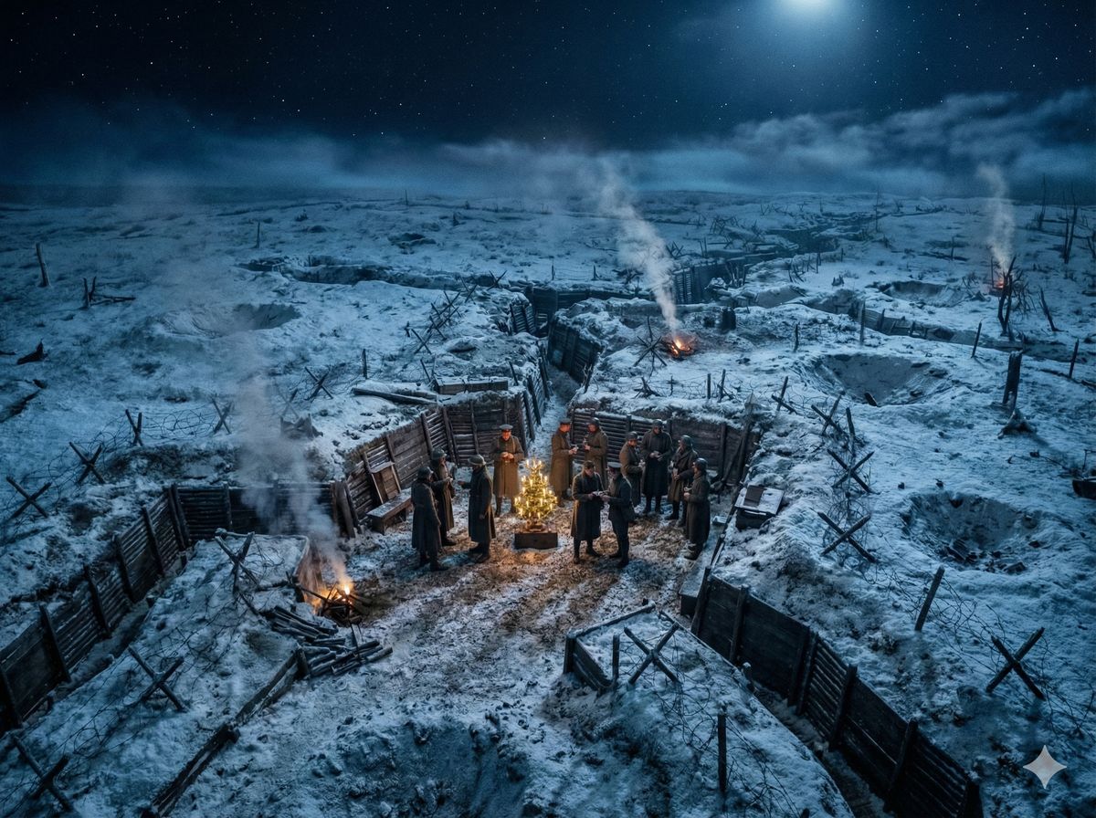 Je to jeden z nejsilnějších a nejdojemnějších obrazů moderních dějin, který každé Vánoce ožívá ve vzpomínkách, filmech i písních. Štědrý den roku 1914, zablácená pole Flander, mráz zalézající pod nehty a náhlé, neskutečné ticho, které přerušila německá píseň „Stille Nacht“. Vojáci, kteří po sobě ještě včera stříleli a zítra měli znovu zabíjet, vylezli ze svých děr, podali si ruce, vyměnili si cigarety za konzervy a v zemi nikoho si zahráli fotbal. V naší realitě tento spontánní „Vánoční mír“ trval jen pár hodin, než generálové v teple štábů zaveleli k palbě a pohrozili polním soudem každému, kdo by se s nepřítelem bratříčkoval. Ale co kdyby ona jiskra lidskosti, která té noci přeskočila mezi zákopy, byla silnější než rozkazy? Co kdyby se vojáci odmítli vrátit k puškám?