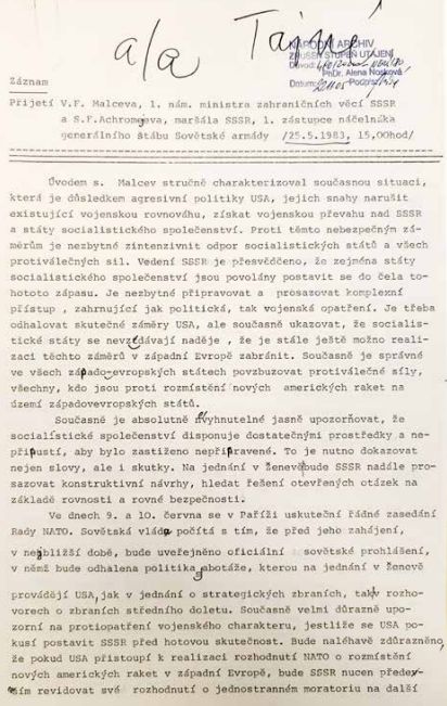 První strana Vajnarova záznamu o jednání Gustáva Husáka s Malcevem a Achromejevem. Značku „a/a“ (ad acta) a označení „Tajné“ připsal na dokument sám Husák. FOTO: se svolením Národní archiv