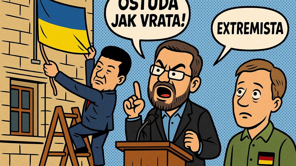 Jenže den nato vyvěsil v Kyjevě českou vlajku. Symbolické gesto díků — a trochu i ironie.