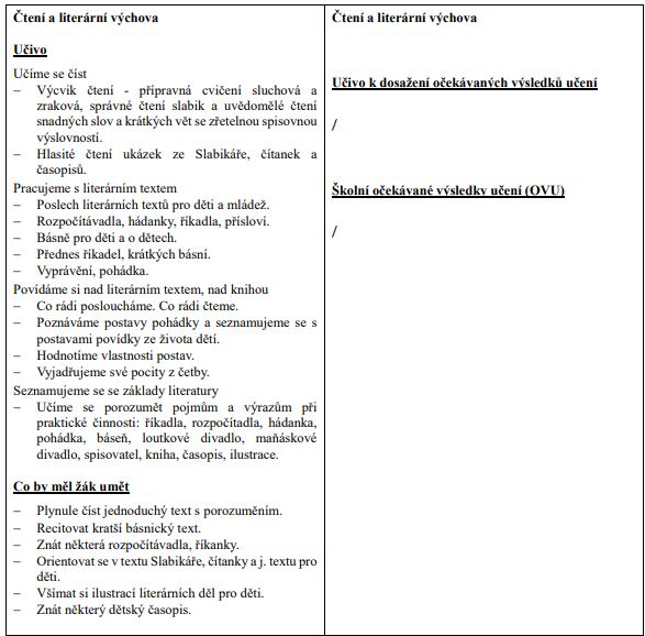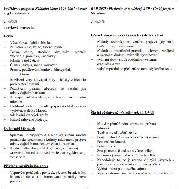 NPI však vydalo poprvé Modelové ŠVP pro ZŠ. Uvádím ukázku pro 1. ročník a srovnání s osnovami před 20 lety. Nejzajímavější je 3. část Čtení a literární výchova.
