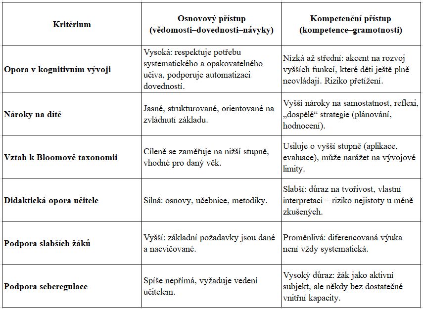 Kompetenční přístup přináší důležitou orientaci na smysl, spolupráci a schopnosti, ale v tomto věku může být didakticky náročný a neefektivní, pokud není přesně ukotvený v učivu a nezohledňuje vývojovou fázi dítěte.