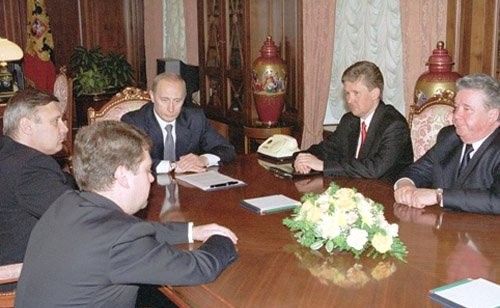 Vladimir Putin s nově jmenovaným generálním ředitelem Gazpromu Alexejem Millerem (druhý zprava).