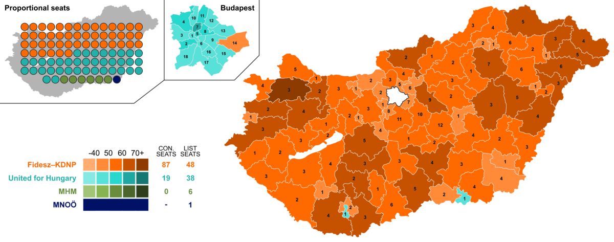Výsledky voleb 2022: Fidesz–KDNP (135-oranžová) Společně pro Maďarsko (57-tyrkysová) Hnutí Naše vlast (6-zelená) Maďarská liberální strana (1-modrá)